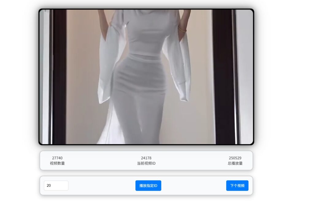 这是一款非常简易的html单页随机小姐姐视频源码,内置API接口,带有视频数量、视频ID、播放量实时统计,可输入指定视频ID进行播放(自动播放下一条视频和手动播放下一条视频),有接口的自己改接口和参数,卡片样式不好看就自己改改CSS,喜欢的自行部署吧!