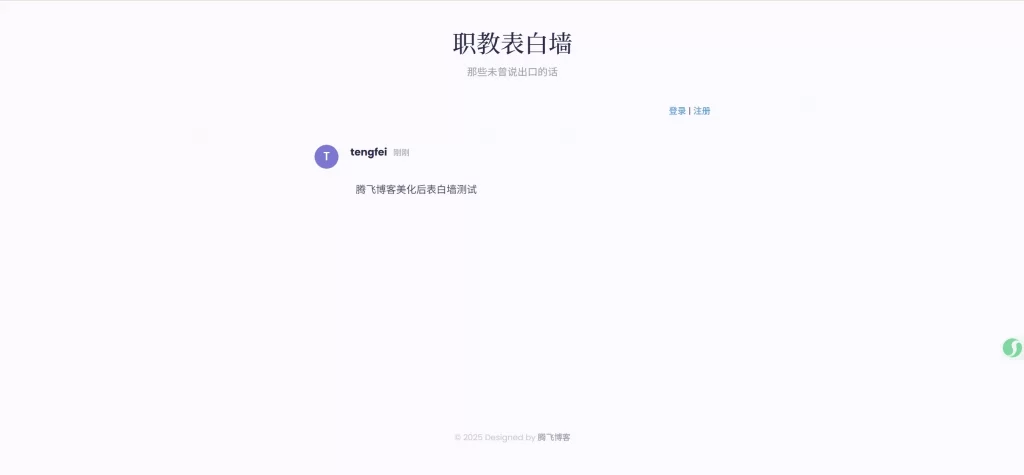 表白墙美化版本源码腾飞博客4个月前更新关注私信09513 文章最后更新时间:2025-07-13 14:04:44这款表白墙是美化版的,并且非常的简约,每个人都可以注册账号然后发布表白,腾飞博客测试了一下,正常运营,喜欢的自行部署吧!源码下载表白墙美化版本源码此内容为免费资源,请登录后查看0积分 登录查看本站资源均为作者提供和网友推荐收集整理而来,仅供学习和研究使用,请在下载后24小时内删除,谢谢合作!免费资源 © 版权声明 All Rights Reserved 免责声明:本站提供用户下载的所有资源均来自网络,版权归作者本人所有,仅限学习和研究目的的,请支持正版! 我们非常重视版权问题,如有侵权请邮件与我们联系处理。敬请谅解!邮件:tfblog@126.comTHE END精品源码# 表白墙点赞13 分享QQ空间微博QQ好友海报分享复制链接收藏