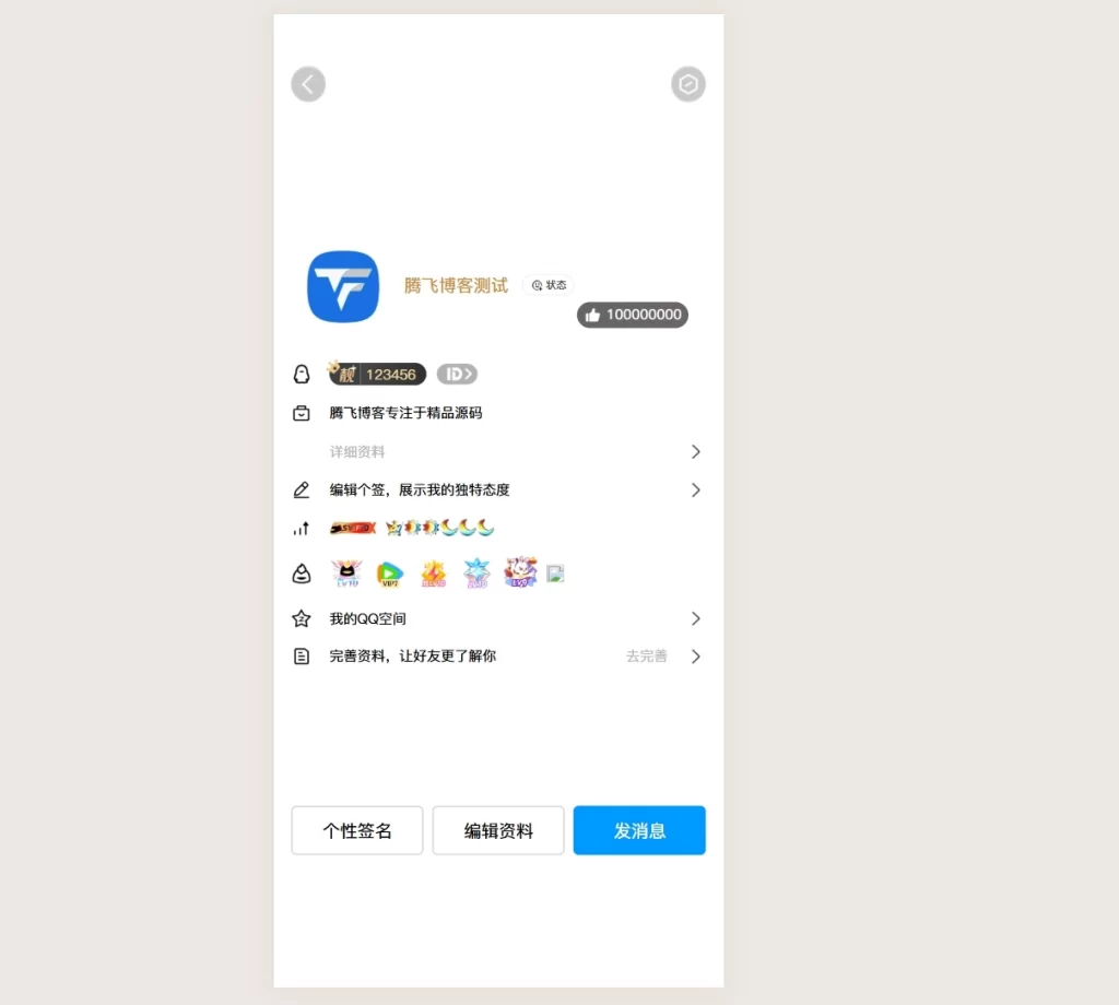 最新版QQ个人资料模拟器源码腾飞博客4个月前更新关注私信015313 文章最后更新时间:2025-07-26 21:31:17这是一款最新版QQ个人资料模拟器源码,源码很简单,直接上传解压就可以使用, 内容在index.html文件里修改,腾飞博客简单的测试了,喜欢的自行部署吧!源码下载最新版QQ个人资料模拟器源码此内容为免费资源,请登录后查看0积分 登录查看本站资源均为作者提供和网友推荐收集整理而来,仅供学习和研究使用,请在下载后24小时内删除,谢谢合作!免费资源 © 版权声明 All Rights Reserved 免责声明:本站提供用户下载的所有资源均来自网络,版权归作者本人所有,仅限学习和研究目的的,请支持正版! 我们非常重视版权问题,如有侵权请邮件与我们联系处理。敬请谅解!邮件:tfblog@126.comTHE END精品源码# QQ个人资料模拟器点赞13 分享QQ空间微博QQ好友海报分享复制链接收藏