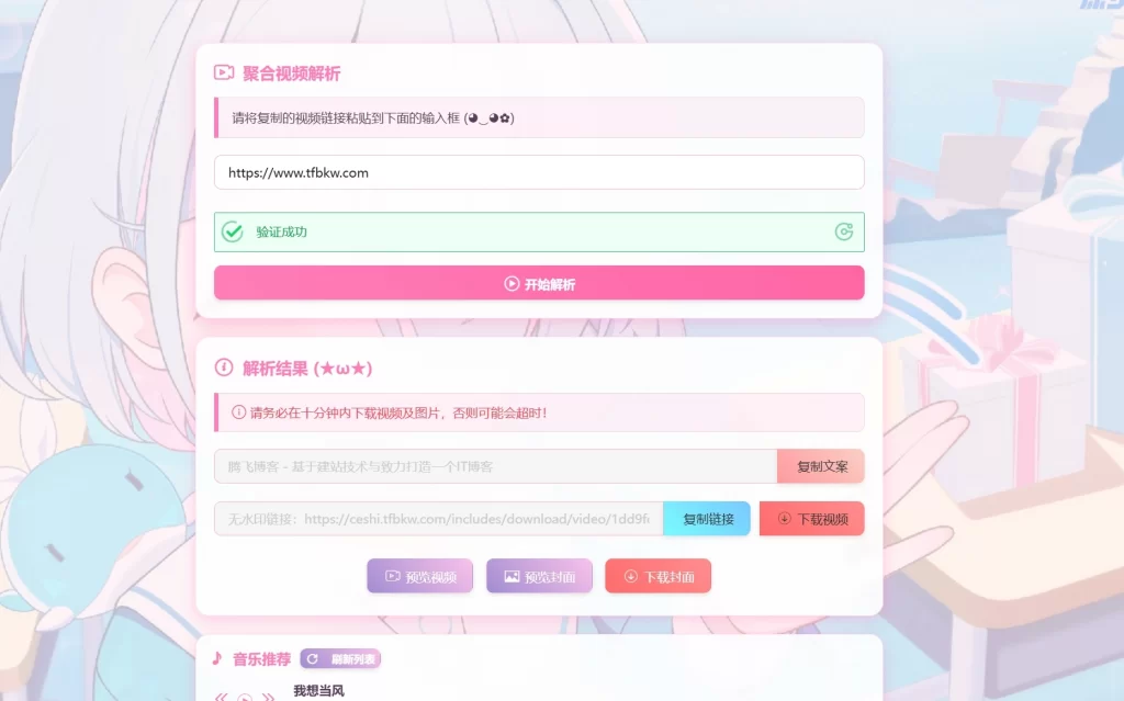 二次元短视频解析系统 – 附带卡密验证腾飞博客7个月前更新关注私信01148 文章最后更新时间:2025-04-07 12:43:44这是一款二次元短视频解析系统,并且说他是付费系统也可以说不是付费系统,更重要的是带有卡密验证,并且有一个简单的卡密生成后台,这里腾飞博客简单的测试了一下,喜欢的自行部署!首先这里测试的是PHP74版本,并且记得安装Source Guardian扩展,后台目录是:域名/km_manager.php,可以自己修改一下目录,有技术的可以二开一下!源码下载二次元短视频解析系统 – 附带卡密验证此内容为免费资源,请登录后查看0积分 登录查看本站资源均为作者提供和网友推荐收集整理而来,仅供学习和研究使用,请在下载后24小时内删除,谢谢合作!免费资源 © 版权声明 All Rights Reserved 免责声明:本站提供用户下载的所有资源均来自网络,版权归作者本人所有,仅限学习和研究目的的,请支持正版! 我们非常重视版权问题,如有侵权请邮件与我们联系处理。敬请谅解!邮件:tfblog@126.comTHE END精品源码# 短视频解析系统点赞8 分享QQ空间微博QQ好友海报分享复制链接收藏1